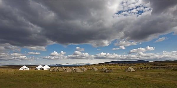 A remote Highland campsite beside geothermal hot springs between Langjökull and Hofsjökull glaciers.