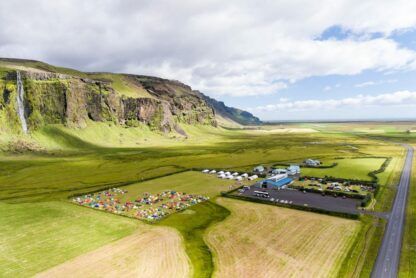 A scenic campsite beside Seljalandsfoss waterfall with views toward Eyjafjallajökull glacier.