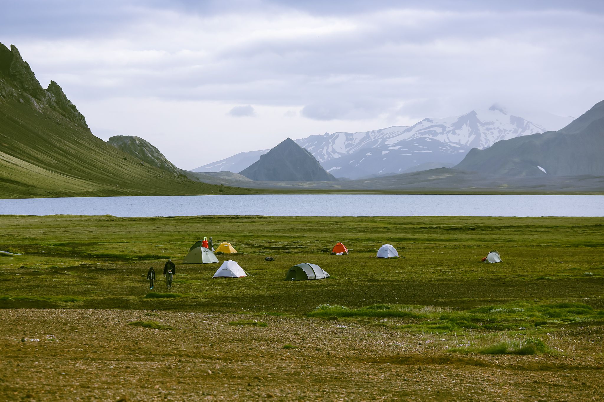 A remote Highland campsite beside Hvítárvatn lake with views toward Langjökull glacier along the Kjölur Route.