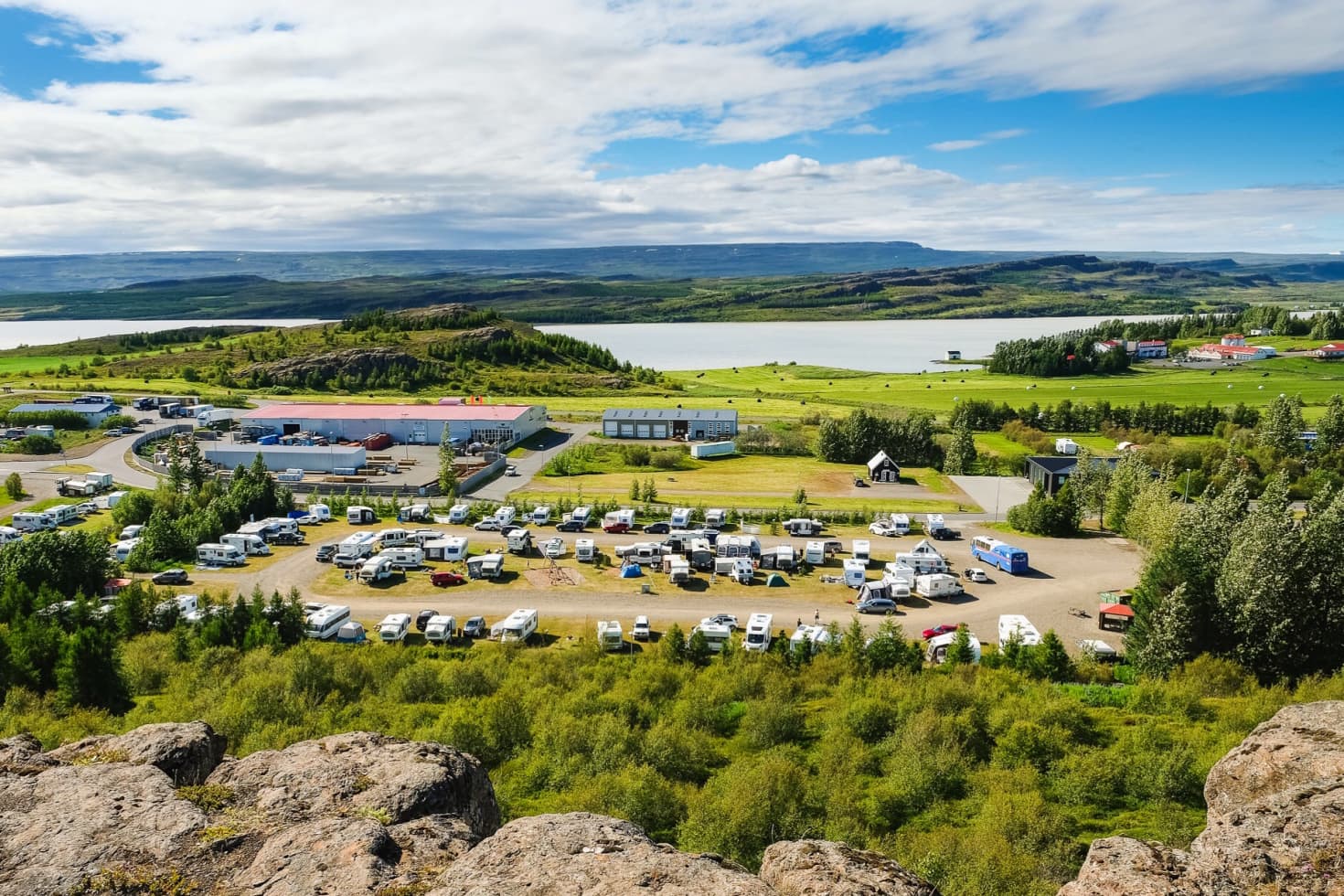 A lakeside campsite in Laugarvatn along the Golden Circle, known for geothermal bathing and scenic countryside views.