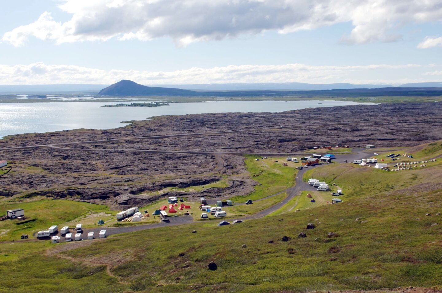 A scenic campsite at Lake Mývatn surrounded by volcanic landscapes, pseudocraters, and geothermal attractions.