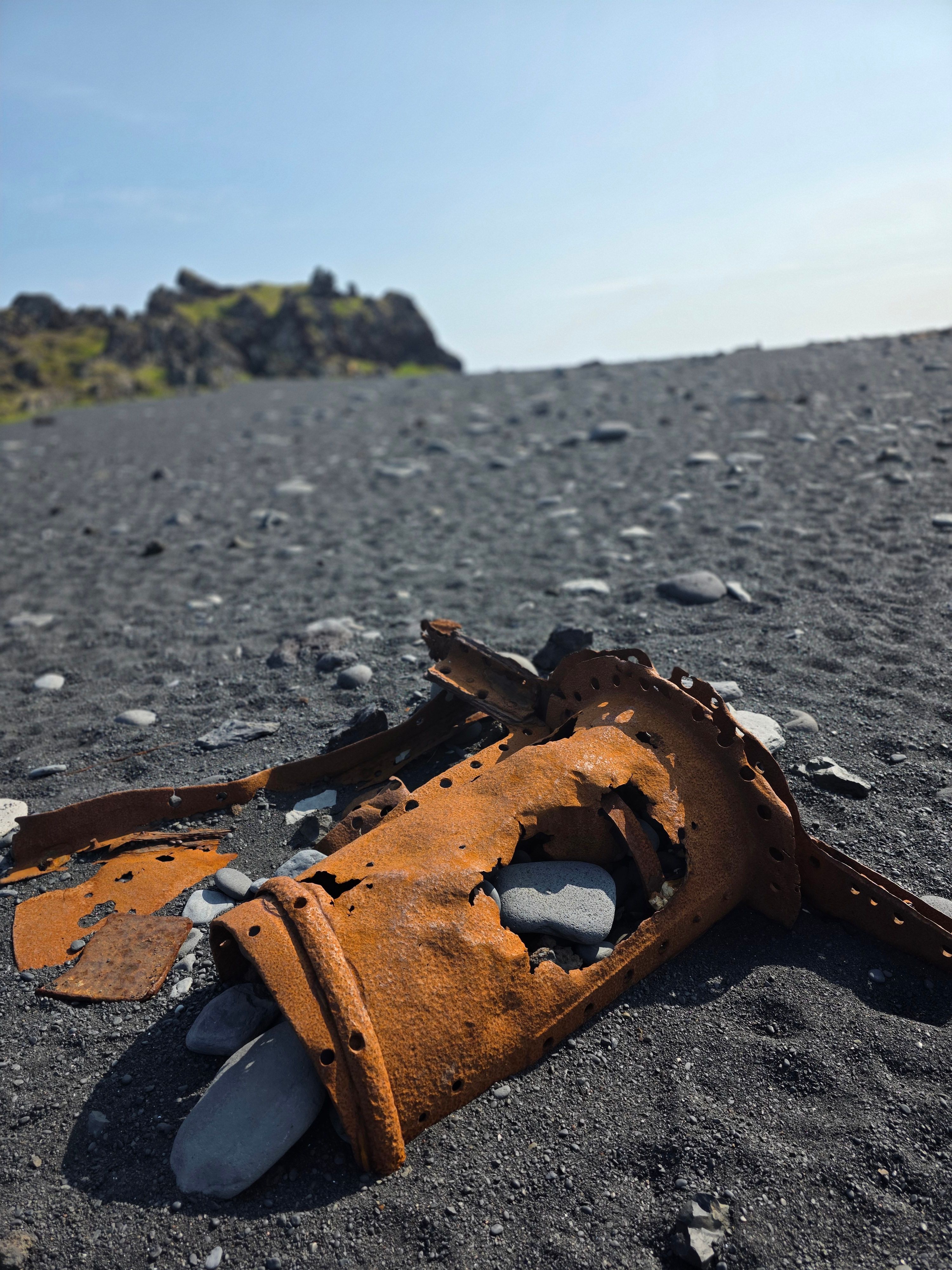 Metal fragments from a British trawler wrecked in 1948 remain scattered across the beach.