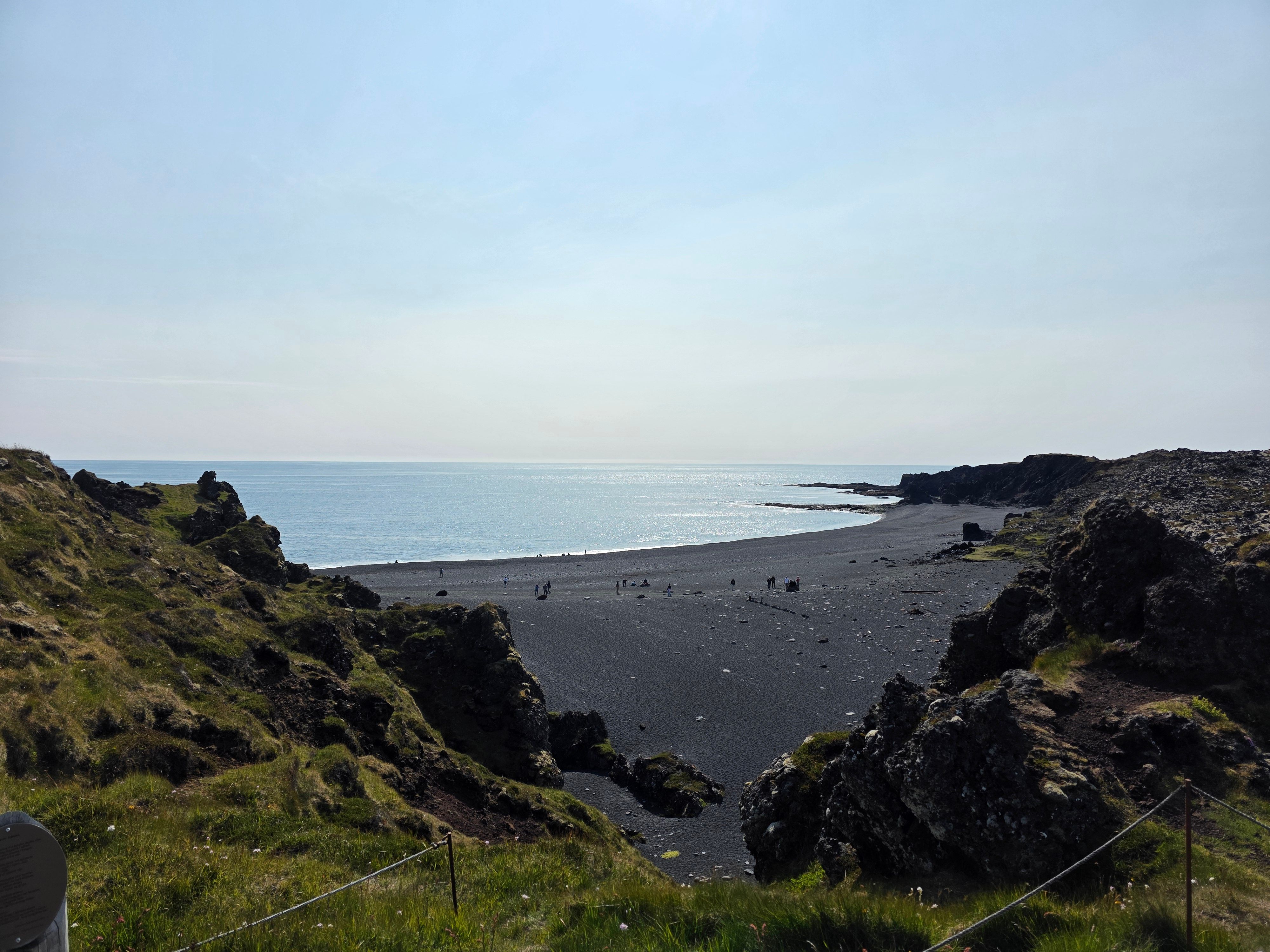 The beach is surrounded by dramatic lava formations shaped by eruptions from Snæfellsjökull volcano.