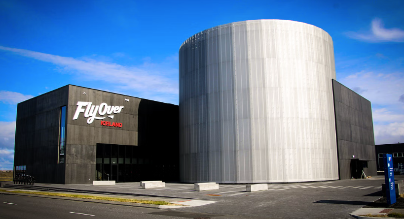 FlyOver Iceland uses the same motion-rider technology as similar experiences in Vancouver and Dubai — high seats tilt and swing while 8K footage fills a massive spherical screen.